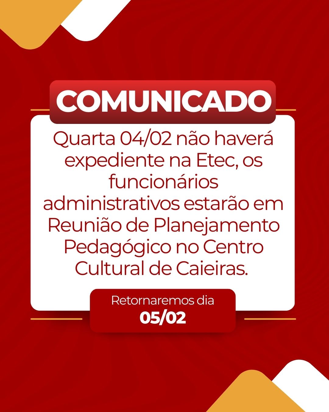 Quarta 04/02 não haverá expediente na Etec, os funcionários administrativos estarão em Reunião de Planejamento Pedagógico no Centro Cultural de Caieiras. A direção