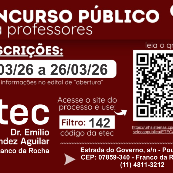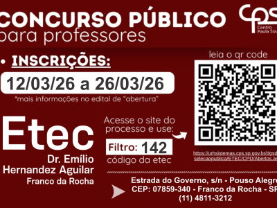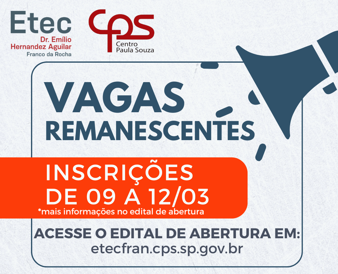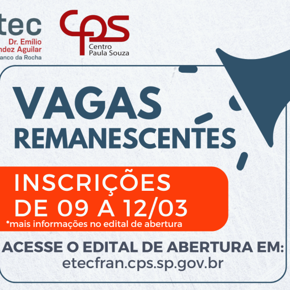 Vagas Remanescentes para o 1º semestre de 2026 Cursos Técnicos Modulares períodos tarde e noite; Inscrições: de 09 até 12/03 na secretaria da Etec das 10h às 19h; *OS INTERESSADOS DEVEM LER O EDITAL ATENTAMENTE […]