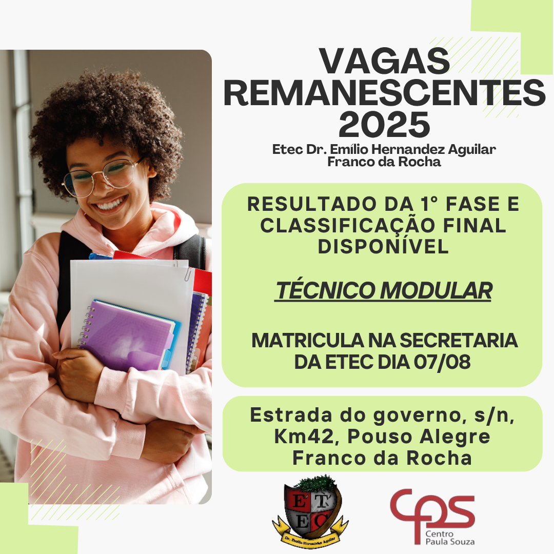 Resultado da 1° fase e classificação final Disponível Técnico Modular Em caso de discordância do resultado da primeira fase, o candidato deverá encaminhar pedido de Recurso à Comissão via e-mail e142acad@cps.sp.gov.br, no prazo máximo de […]
